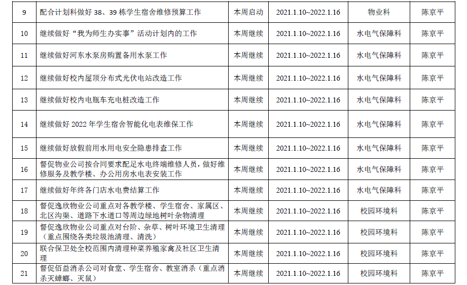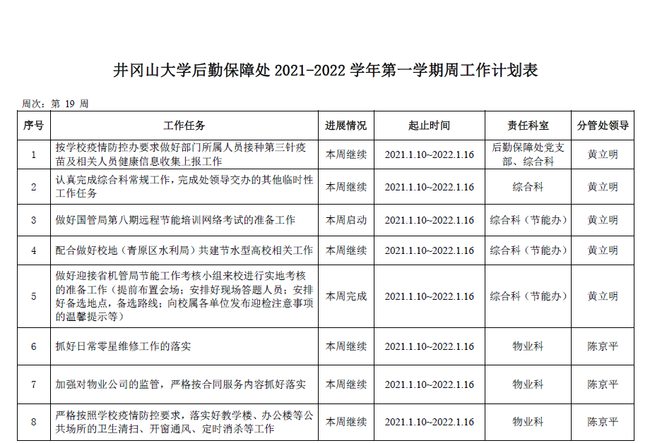 2021--2022学年第一学期第19周工作计划表