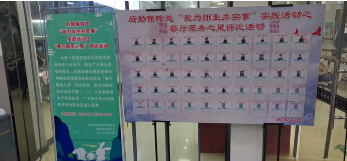为推进校园餐饮文化建设,进一步提升各餐厅服务质量,2021年11月22日—29日,后勤保障处组织各餐厅开展了“服务之星”评比活动,整个活动分为前期宣传、公开投票、总结表彰等环节内容。