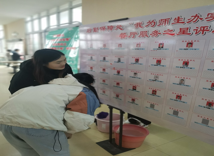11月22日—26日,各餐厅通过展板展出全体员工的照片和编号,接受用餐师生的投票,师生们根据平时对窗口服务人员的观察和了解,在自己认为最满意和喜爱的服务员信息下粘贴小五角星,为其投上宝贵的一票,为保证评选活动公平、公正,膳管会学生负责在早、中、晚三个时段对投票过程进行监督,对票数进行统计。
