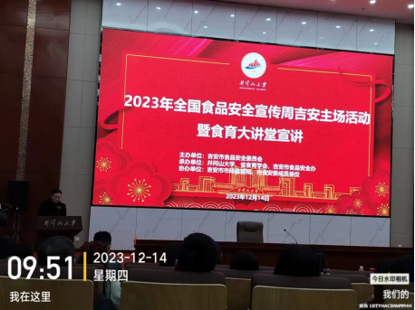 为贯彻落实省政府2023年工作报告重点任务要求,深入实施食育普及三年行动计划,加快推进食品安全、科学膳食、营养健康、饮食文化等食育研究与推广普及工作发挥食育在食品安全监管方面的重要作用,12月14日上午,由吉安市食品安全委员会主办的2023年全国食品安全宣传周吉安主场活动暨食育大讲堂宣讲活动在我校举行,宣讲活动特邀江西省教育厅评估院综合事务服务处胡若峰处长为主讲嘉宾。活动由吉安市市场监督管理局副局长许锋主持,吉安市市场监督管理局局长周晓霞、江西省食育学会办公室主任李曦晖、井冈山大学后勤保障处和吉安市食安委成员单位相关负责人出席活动。