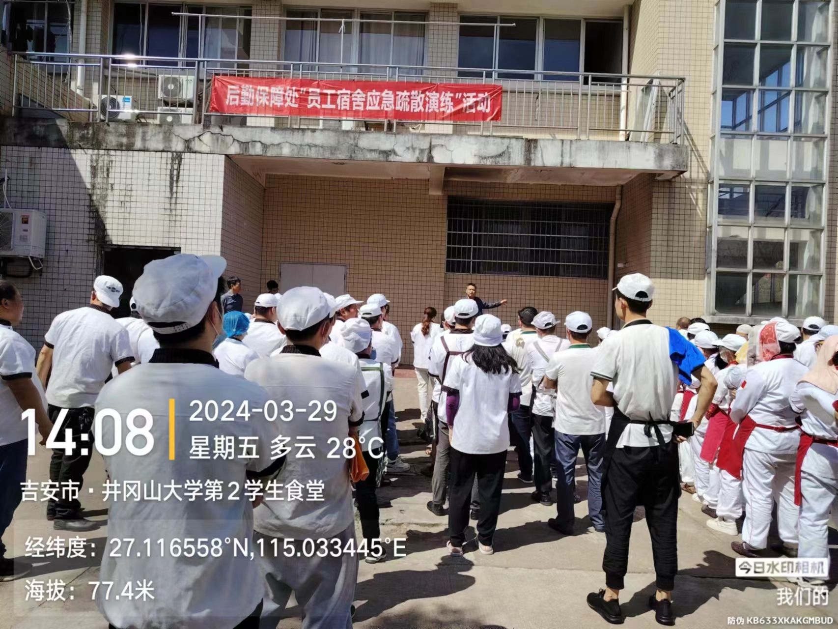 为进一步提高食堂员工的消防安全意识和应急处置能力, 2024年3月29日下午,后勤保障处组织各相关餐饮公司全体员工在第二食堂举行了一场火灾疏散逃生应急演练。邀请校保卫处消防科张彬老师现场指导,后勤保障处处领导及餐饮管理科负责同志参加演练。